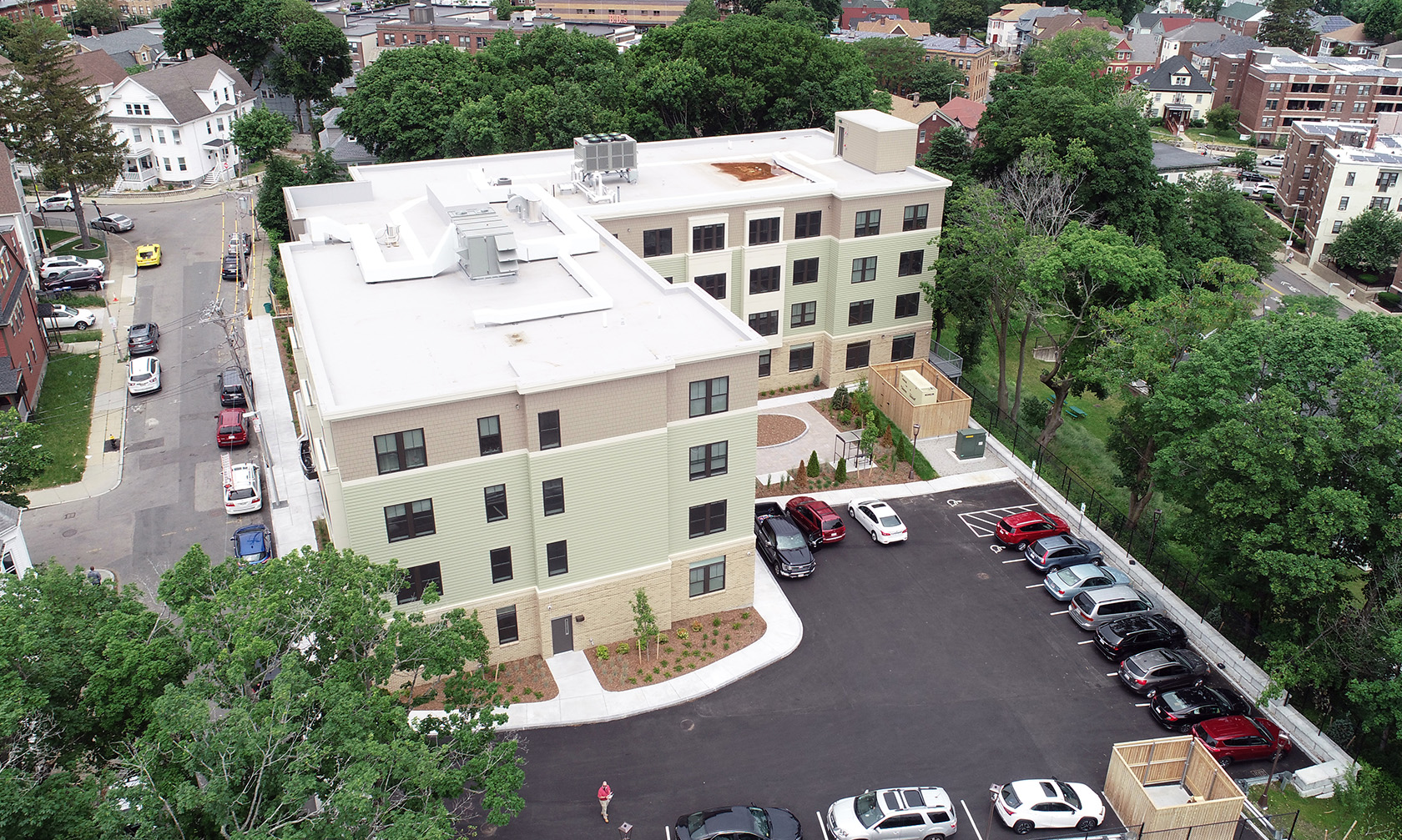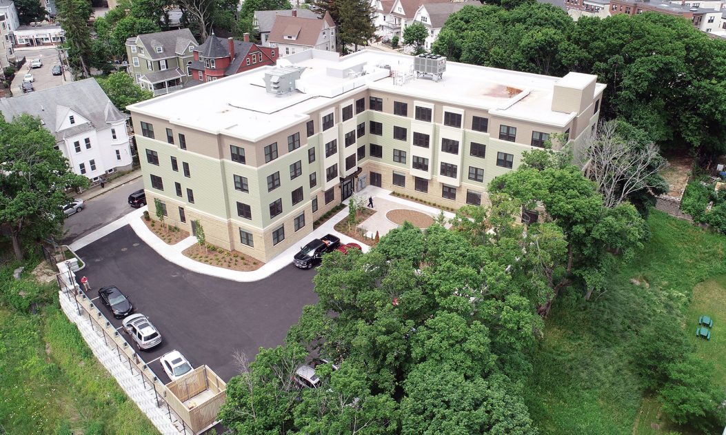 D.F. Pray completed construction of Hearth at Four Corners, a 54-unit affordable senior community in Dorchester. Residents will be 62 and older, with incomes ranging from extremely low to moderate. The development is comprised of 48,867 sq. ft. of gross floor area offering 52 affordable, single-bedroom units, two studio units and 14 surface parking spots. The community features four levels of residential units, passive and active recreation space for residents, staff office space, as well as a ground-floor community meeting room. Hearth at Four Corners is aiming for LEED Silver certification.
