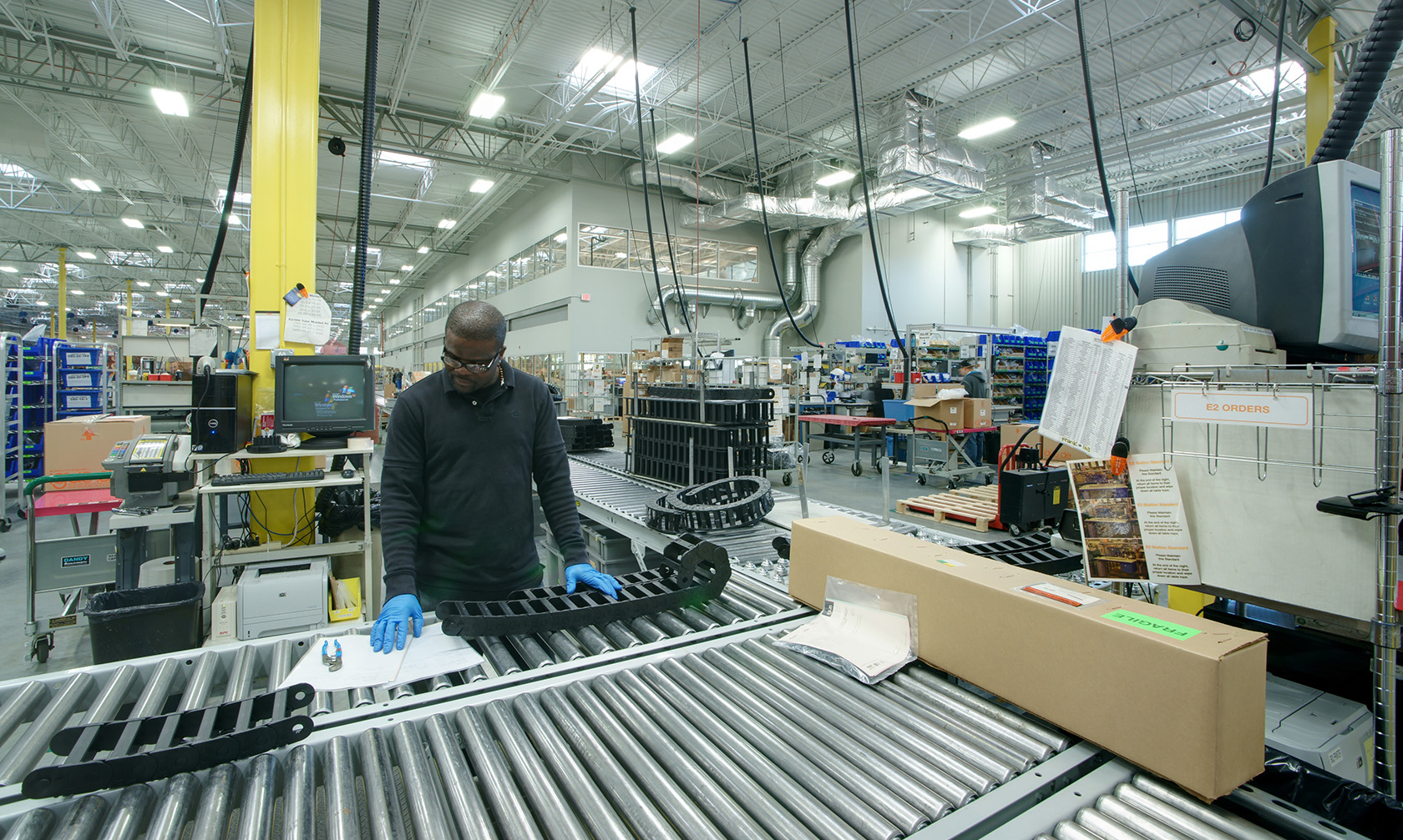 The production floor was designed with a wall louver system that pulls in cool outside air and exhausts warmer air through roof exhaust fans on summer days. The facility includes 12 loading docks for shipping and receiving, including 2 drive-through doors for oversized shipments.