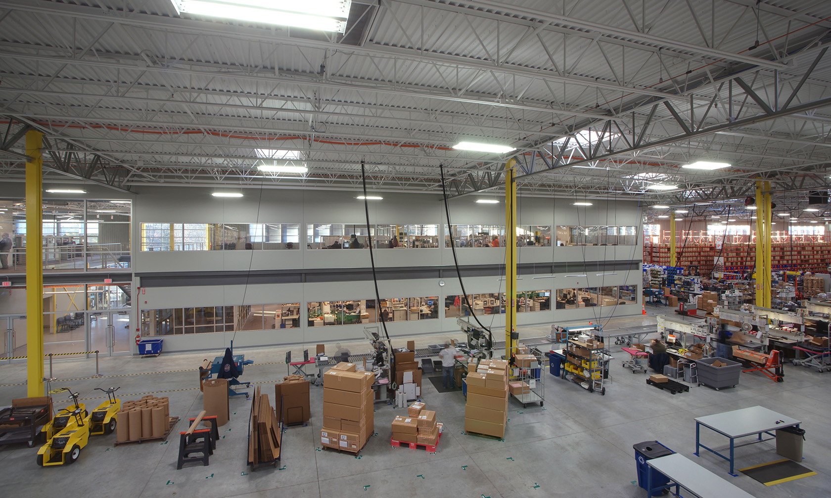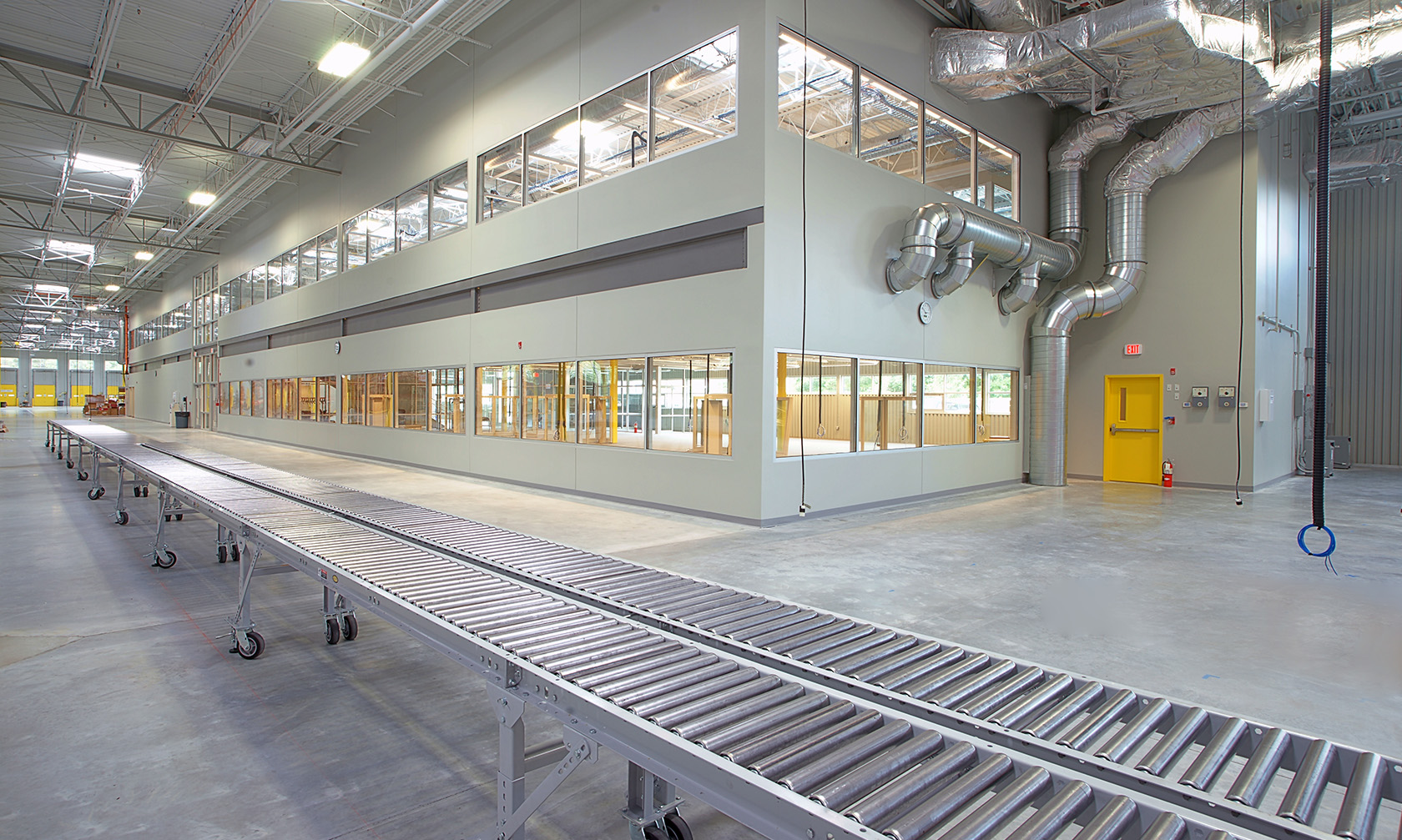 The 700’ long building includes 135,000 sq. ft. of production space and 25,000 sq. ft. of office space, including a cafeteria with walkout patio and restrooms, all spanning two levels. Glass walls installed on both levels of the office space allow views around the office and into production.